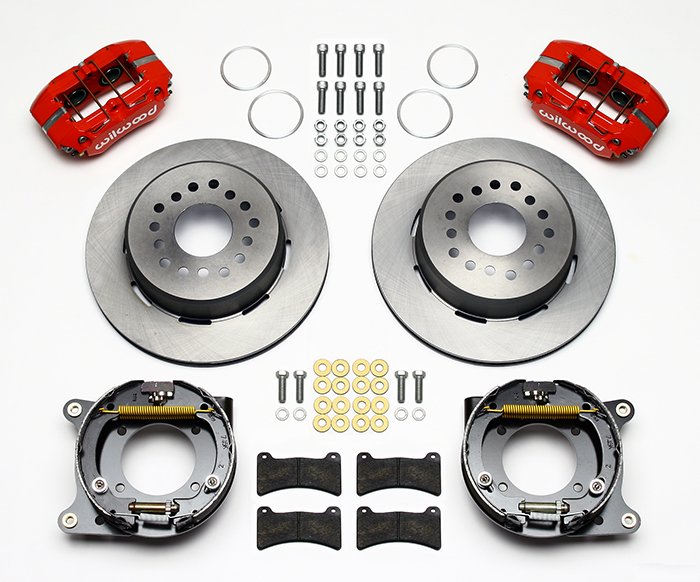 Forged Dynapro Low-Profile Pro-Series rear disc brake kits provide a complete solution for popular muscle car rear axles on applications that require a parking brake assembly and extra clearance for 14.00” to 15.00” rim applications. Forged billet Dynapro Low-Profile four-piston calipers 11.00” one-piece hat and rotor assemblies, and high friction pads provide optimized and balanced braking for all types of custom performance street/strip and show machines. The neatly hidden internal shoe system provides a clean installation with superior static holding power for parking. Optional caliper finishes and rotor designs enable the builder to personalize the style and optimize brake performance for every individual application.