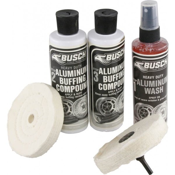 For all aluminum surfaces except rough cast. Restores a brilliant shine to surfaces that are extremely difficult to polish by hand. Works well on aluminum wheels, engine accessories, plus most brass and stainless accessories. A drill is required. Kit contains 8 oz. HD wash, ½ lb. HD buffing compound, ½ lb. High luster buffing compound, 2 buffs and drill arbor.