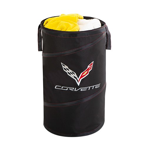 C7 Corvette Pop-Up Spiral Bin Heavy-duty polyester material with tension loop steel frame. Free standing, folds flat for storage, and has easy carry handles. Ideal for garage storage, dirty shop towels, or trash bin at a car show, garage, or man cave. C7 Corvette emblem embroidered. Size: 15” w x 15” d x 25” h