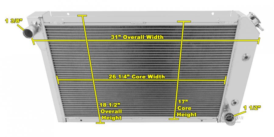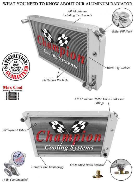 Our Economy series radiators are designed for car enthusiasts looking for an affordable cooling solution for their classic car that is nearly stock condition. Though some muscle cars or modified vehicles with a higher horsepower rating may require one of Champion Cooling’s three or four row radiators, these economy series radiators are built with two-row brazed aluminum cores that are tig-welded to aluminum tanks with approximately 14-16 louvered fins per inch, a brass petcock, and all are designed with aircraft grade aluminum. The tubes are 3/4” thick with a 1 1/2” core. In most cases this all aluminum design allows for stronger wider tubes that enable a two row aluminum radiator to outperform a three row copper brass of equal dimensions, while also being more affordable and lighter weight. We recommend this series for most applications with 500 horsepower or less.