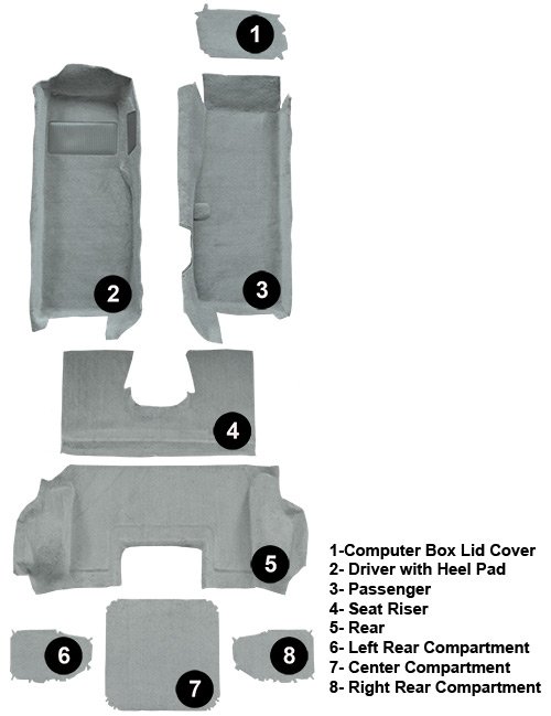• Right and left fronts computer cover main rear riser and 3 compartment door covers. Does not include the 3 pieces of carpeted plastic for the tail light section.