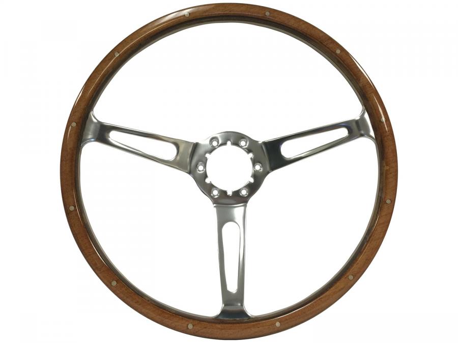 S6 Classic Wood series come in real walnut wood grip option (with rivets) with polished aluminum anodized center finish and slotted center design. They feature a 15 in. diameter with a 2 in. depth for turn signal clearance.