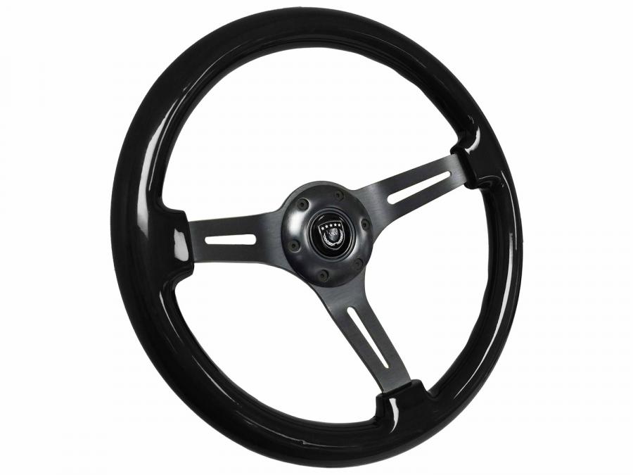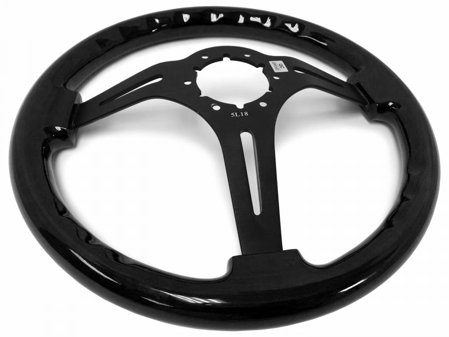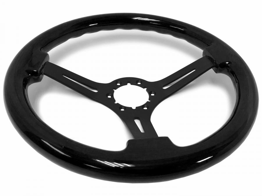 S6 Sport Wood series come in real black ash wood finish with high quality black center finish and slot design. They feature a 14 in. diameter with a 2.5 in. depth for turn signal clearance. The grip thickness is 1.25 in.