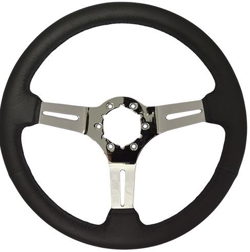 This Volante S6 Sport Series steering wheel features a chrome 3 spoke design. Wheel will fit factory GM 6 bolt hub adapters or will need a Volante S6 hub adapter and horn button.