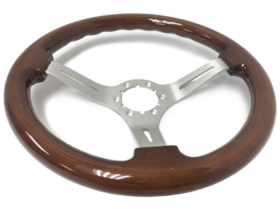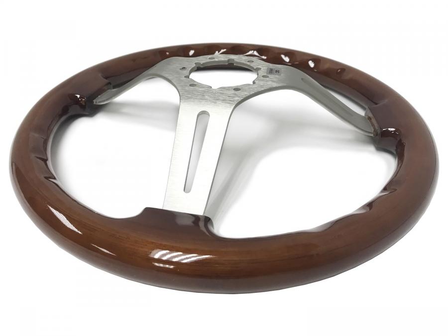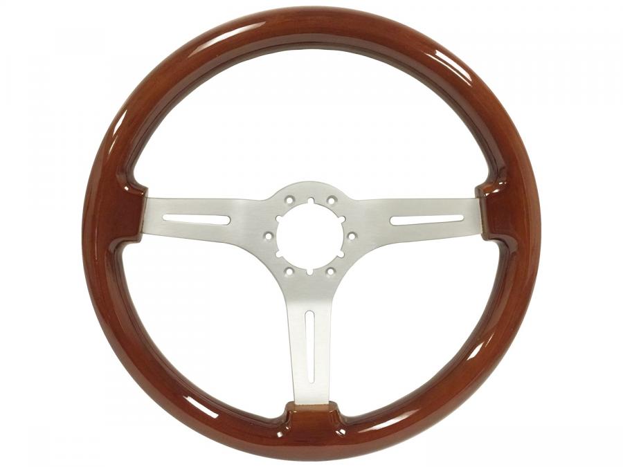 S6 Sport Wood series come in real mahogany wood finish with high quality brushed center finish and slot design. They feature a 14 in. diameter with a 2.5 in. depth for turn signal clearance.