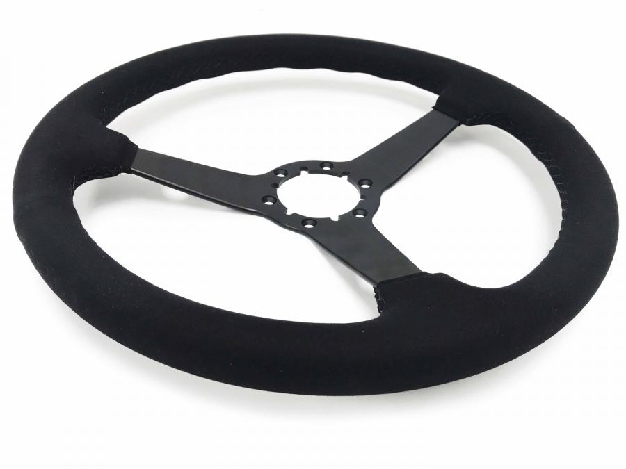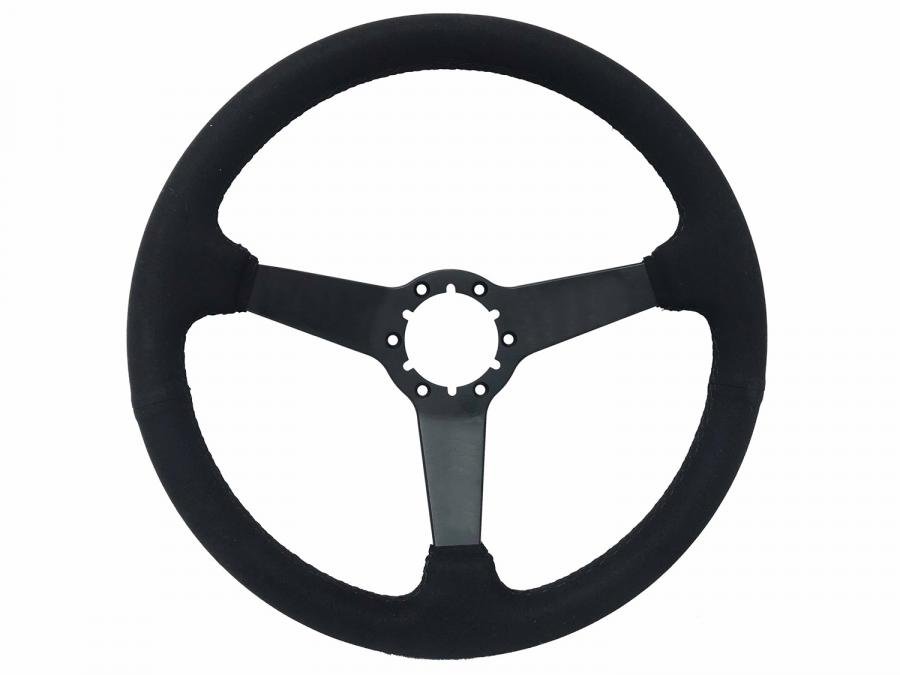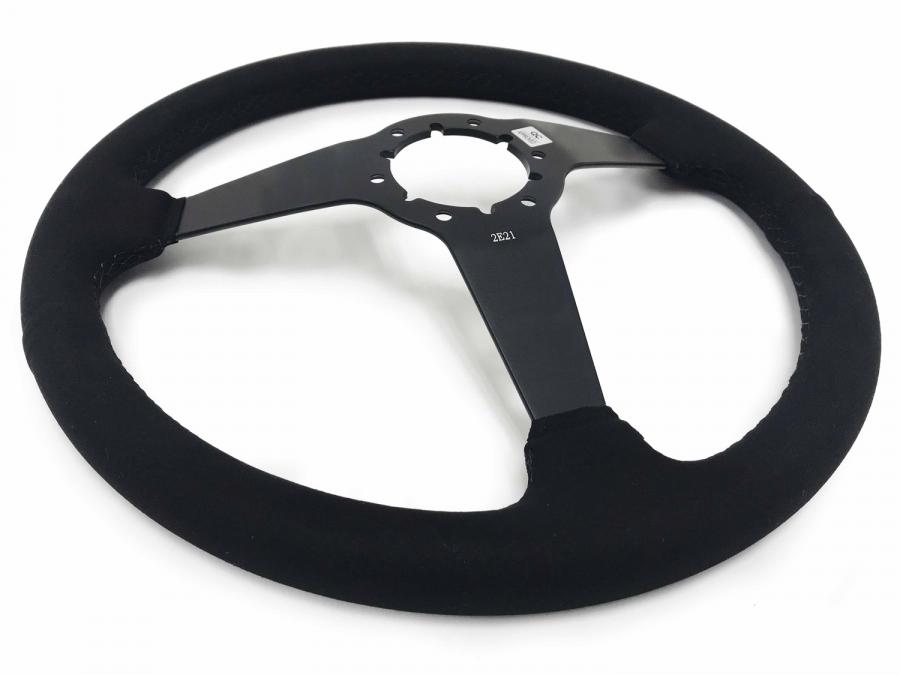 S6 Sport Suede series come in ultraluxe suede grip option, similar to alcantara with black anodized center finish and solid spoke design. They feature a 14 in. diameter with a 2 in. depth for turn signal clearance.