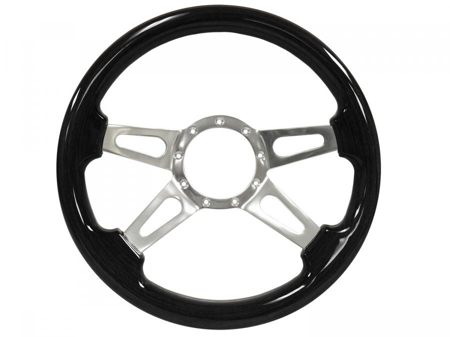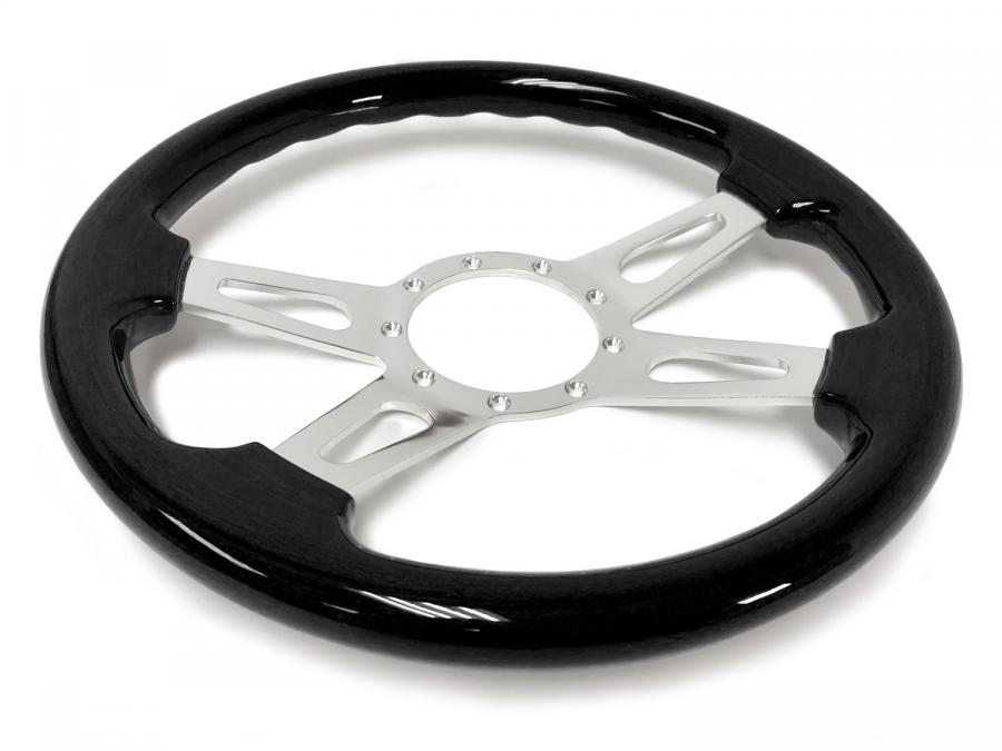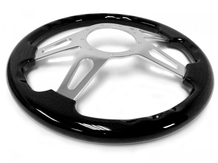 S9 steering wheel series come in real black ash finish wood grip option with polished aluminum anodized center finish. They feature a 14 in. diameter with a 2 in. depth for turn signal clearance. The grip thickness is 1.25 in.