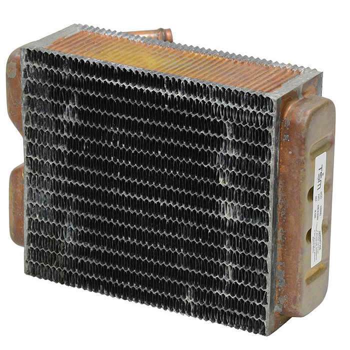 The formed tanks, channels, and tubes on this C3 Corvette Heater Core are brass. The water channels and air fins are roll formed from a copper ribbon. The assembly is held together with a flux and solder dipping process to prevent leakage.