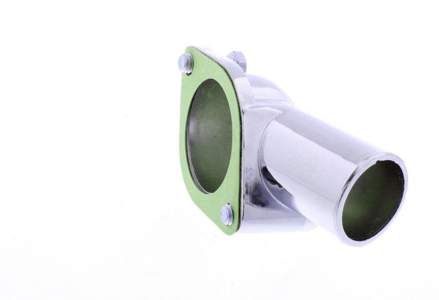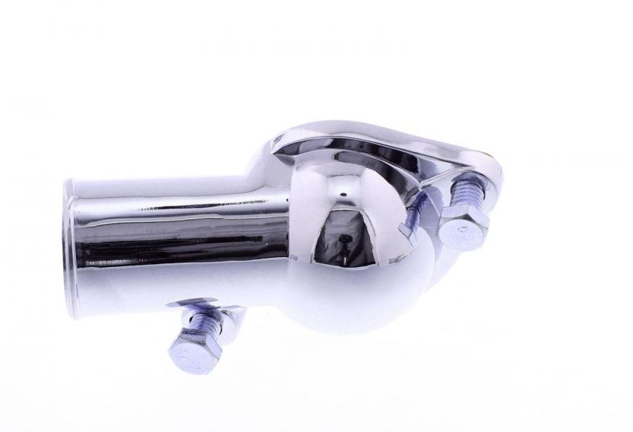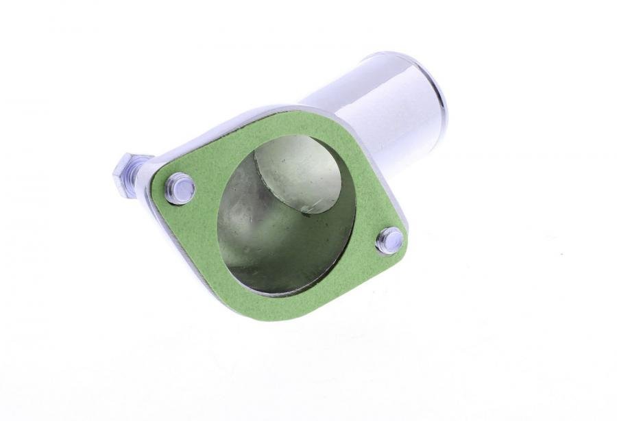 Neck is angled towards drivers side. Beautifully chrome plated. Uses gasket for a perfect seal.