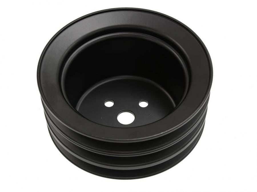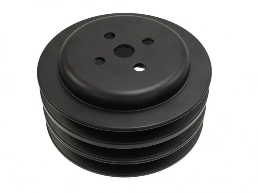 Water pump pulley, 3 groove. 5 1/2" O.D. Replacement style. Aluminum with black finish. 1966-67 with Air Conditioning, 1968-70 All 427 and 454.