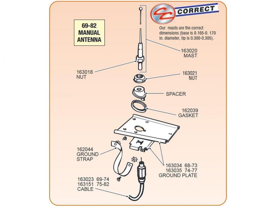 1969-1978 Corvette antenna mast retainer nut has 1/2 inch x 20 threads. Nut is 7/16 inch tall . Has 9/16 inch wrench flats. Top hole measures 0.414 inch ID.