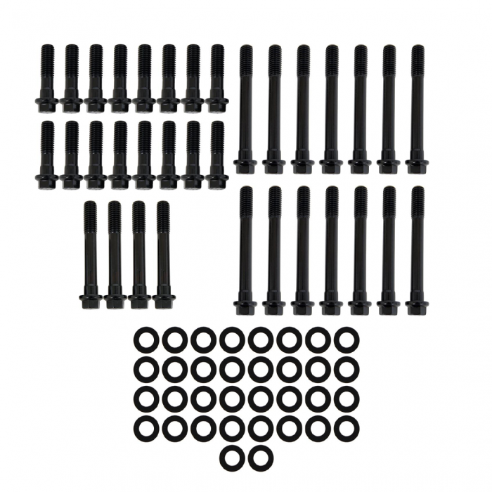 Manufactured by ARP for Edelbrock, these kits contain a complete set of the highest quality head bolts and hardened washers available. Cold-formed to ensure molecular integrity and heat-treated prior to thread rolling and machining. Reduced diameter bolt heads eliminate the need for valvetrain removal to allow cylinder head retorquing. Hardened and parallel-ground washers are included. Rated at 170,000 psi.
