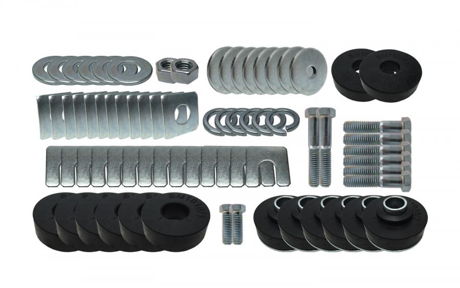 This body mounting kit contains all mounting bushings with all hardware included. It is correct S.B.R. compression molded with steel sleeve inserts. Bushing are made of high grade non recycled rubber.