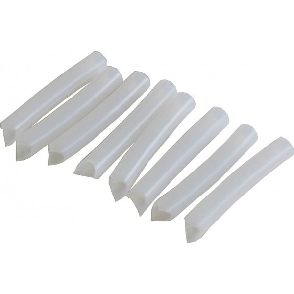 Space age plastic sleeves install without removal of calipers and stop squeaks caused by loose fitting pads. One set outfits 4 calipers.