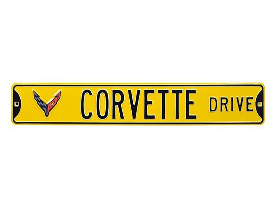 Liven up any street corner or garage wall, man cave, or office with this quality embossed metal C8 Corvette StreetSign. Measures: 36" x 6".