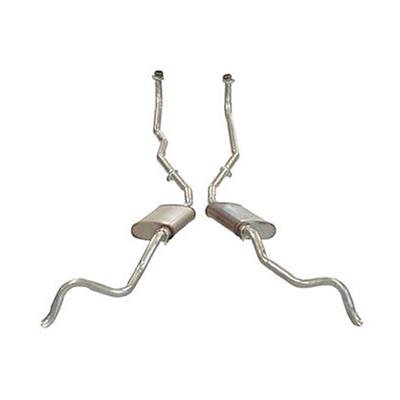 No hangers. Exhaust system components are made from 14 gauge (.070) aluminized pipe (1 7/8" diameter tailpipes-16 gauge. Welded oval original muffler type. Application low performance. All 1 x 4 carburetors with 2" manifolds.