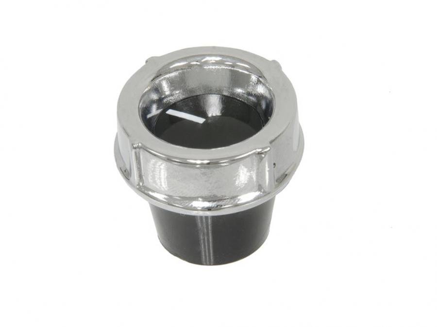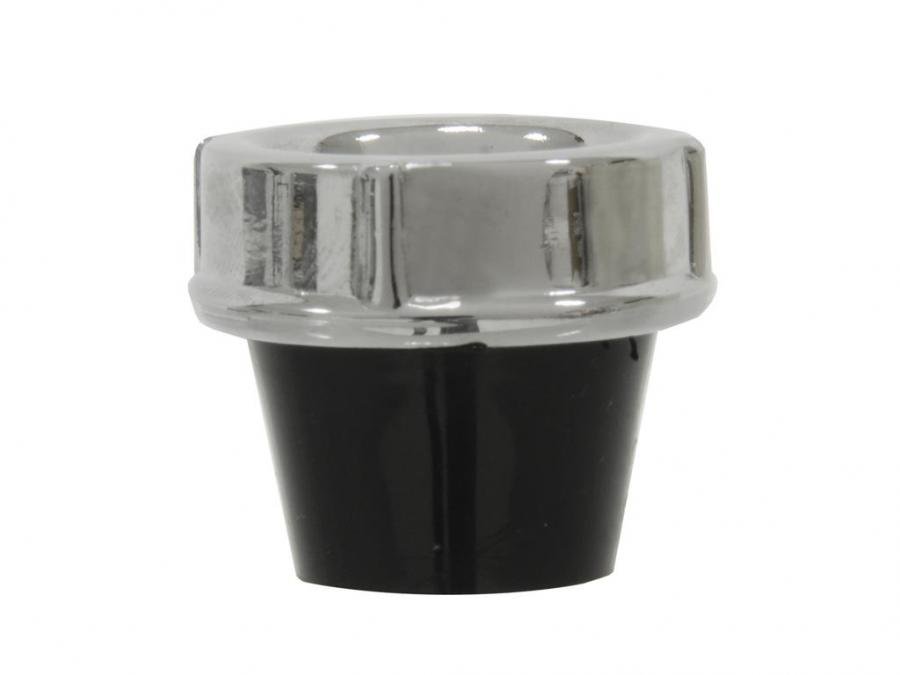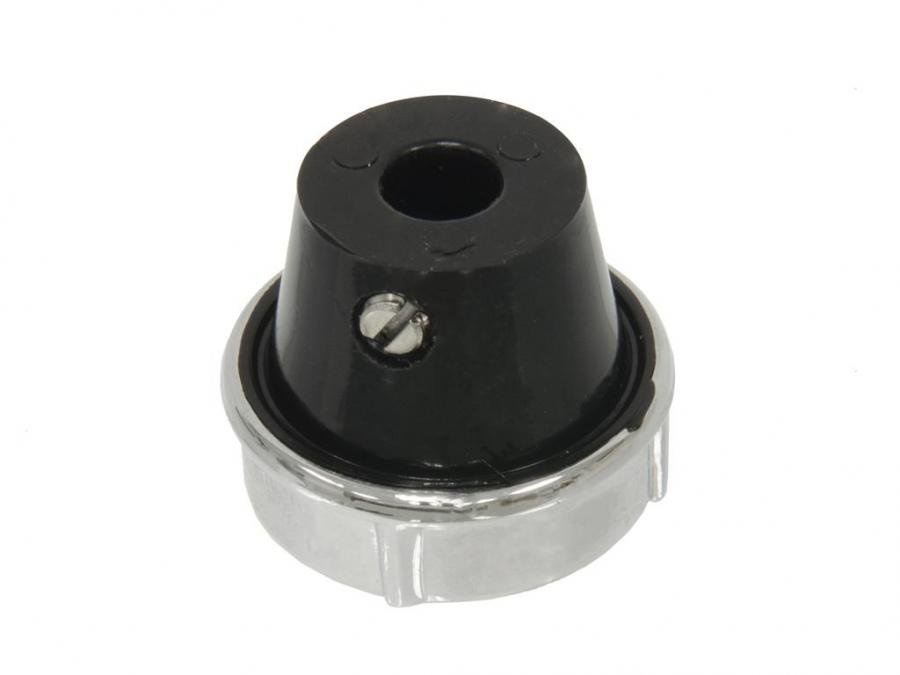 Chrome ring with black plastic center and back. Includes set screw for installation. This knob has a white indicator line on the face.
