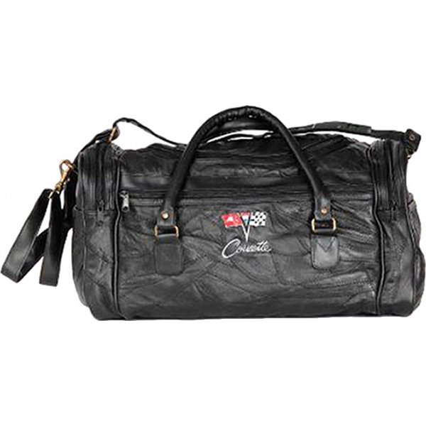 This genuine black lambskin Corvette Leather Bag boasts a zippered compartment and outer pocket at both ends, a roomy zippered main compartment, a reinforced bottom, and full-length zippered side compartments. "Patchwork" design Corvette Leather Bag comes with reinforced leather handles and a removable leather shoulder strap. Comes with full-color C2 emblem. 16" x 8" x 9".