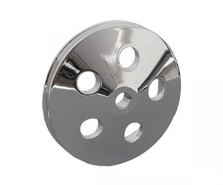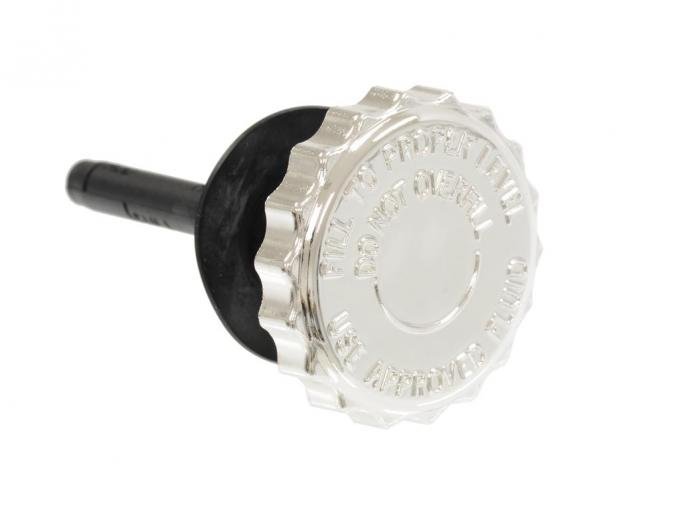 Chrome plated factory style plastic power steering pump reservoir cap, includes gasket. Top says "Fill To Proper Level Do Not Overfill" and "Use Approved Fluid"