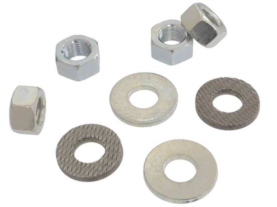 Includes correct nuts and washers to mount strut rods and studs for both sides of the car. (8 pieces) The serrated side of the washer goes to the strut bracket, to keep it from spinning. The smooth side faces the nut.