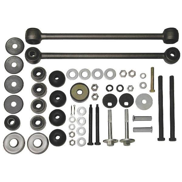 Rear suspension bushing kit includes: rear spring mounting kit, upper and lower rear end mounting cushons, differential bolt set, trailing arm bolt set, strut rods (75-82 style) with 1-5/8" diameter bushings, trailing arm retainers, strut rod adjustment assemblies, trailing arm bushings and trailing arm bushing plates.