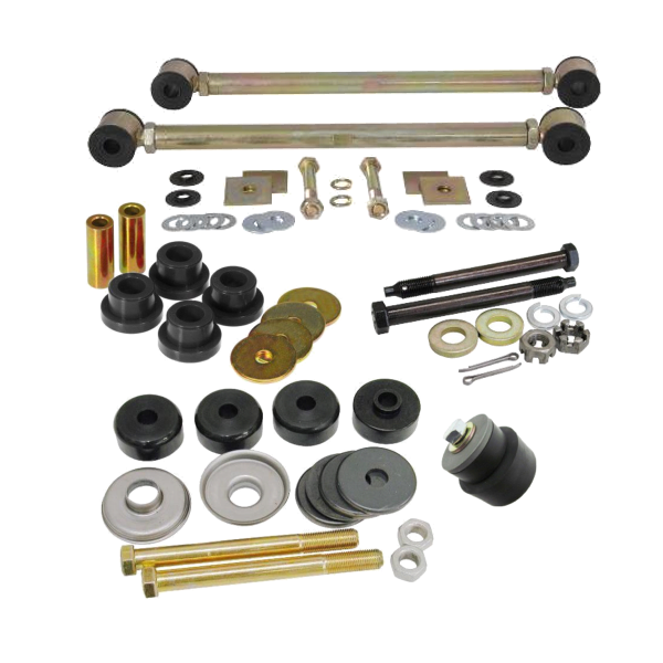 Rear suspension bushing kit includes: polyurethane rear spring mounting kit, polyurethane upper and lower rear end mounting cushions, differential bolt set, trailing arm bolt set, adjustable strut rods, trailing arm retainers, polyurethane trailing arm bushings and trailing arm bushing plates.