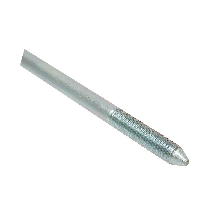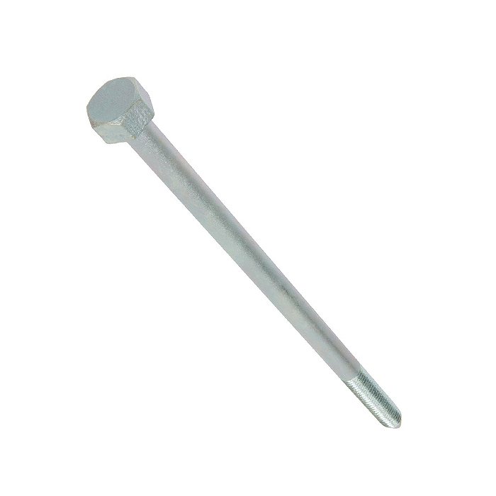 Bolt dimensions = 7/16 x 14 x 9 1/4 inches, 3/4 inch hex. This bolt measures 1/2 inch x 14 inch x 9 1/4 inch. The threaded portion is 2 1/4 inch, the undreaded shaft is 7 inch. The head is a 3/4 inch that measures 3/8 inch tall. The tip is blunt pointed. The headmark shows concentric circles that resemble machining marks. The coating is clear zinc.