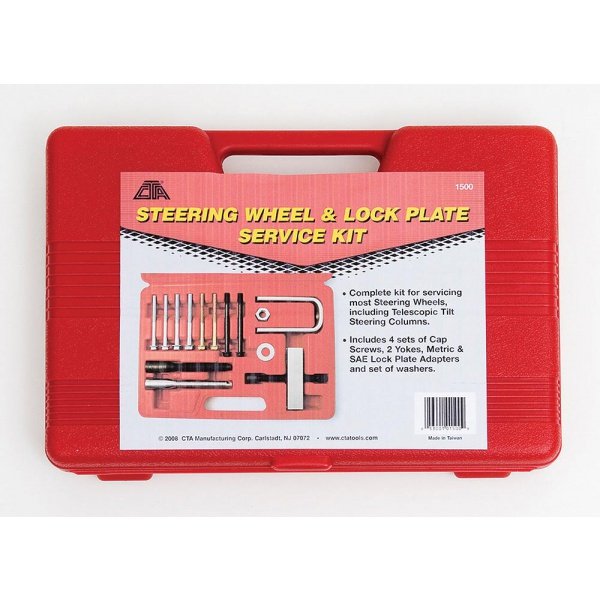 Complete kit for servicing most domestic steering wheels, including telescopic tilt steering columns. Includes 4 sets of cap screws, two yokes, metric & SAE lock plate adapters and washers. Packed in blow mold case.