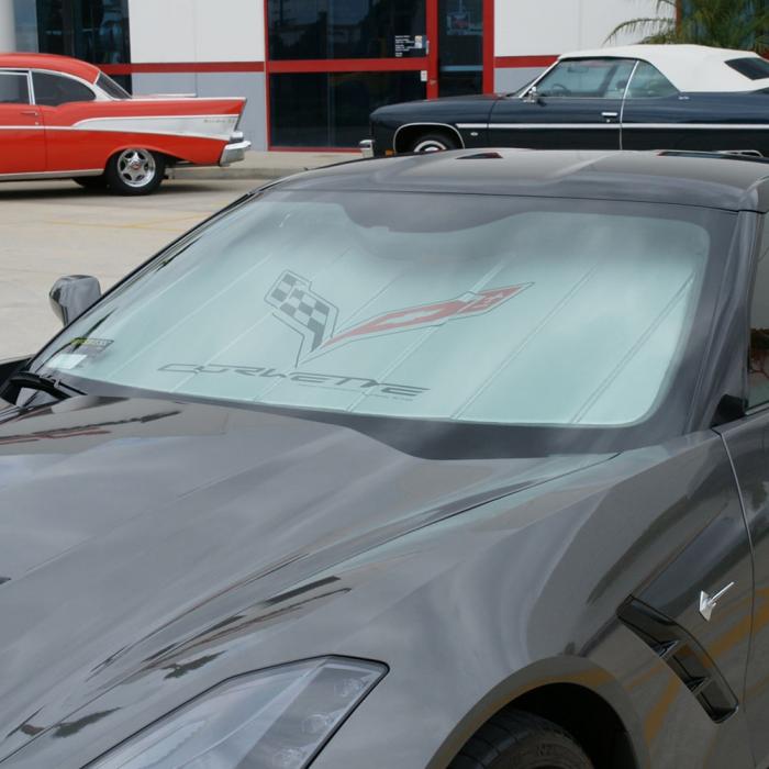 These GM Licensed C5 Corvette Logo folding accordion design windshield sunshades are custom fit for your C5 Corvette. They fit into the corners of your windshield to completely block out the sun on your new dash. These insulated folding heat shields help reduce interior temperature and also protects the interior from harmful rays of sun. One side is a silver reflective fabric and the inner side is soft felt. This sunshade quickly and easily folds away for easy storage.