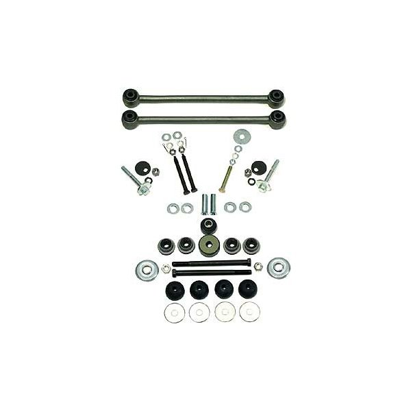 Rear suspension bushing kit includes: rear spring mounting kit, upper and lower rear end mount cushons, differential bolt set, trailing arm bolt set, strut rods with bushings, trailing arm retainers, strut rod adjustment assemblies, trailing arm bushings and trailing arm bushing plates