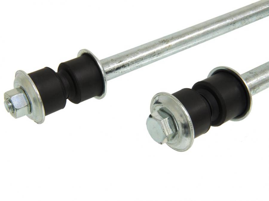 Kit includes the correct "U" headmark bolts, retainers, and rubber grommets to mount both ends of the front stabilizer bar. Set of 2 links. These stabilizer end link bolts measure 11 3/8 inches. Spacer tube length 6 7/8 inches.
