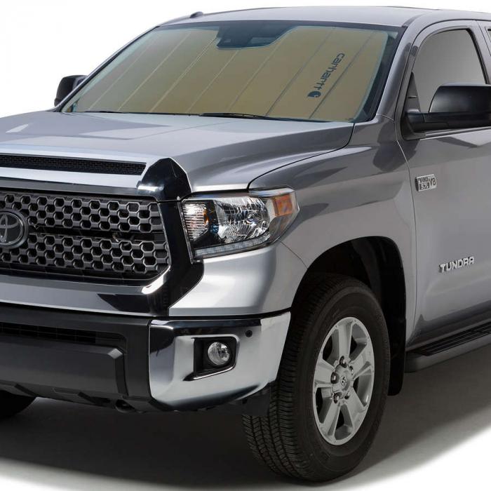 Featuring the iconic Carhartt logo and a custom run "brown" reflective finish, this custom patterned sunscreen not only helps reduce the interior temperature when it's hot outside, it also helps protect the vehicle interior from damaging UV rays that enter through the front windshield all year long. These sunscreens are custom fitted to your vehicle to ensure maximum windshield coverage and ease of installation. Also known as heat shields, sun shields or UV shields, sunscreens are useful at the beach, work, airport or anywhere you park.This premium quality, custom patterned folding sunscreen has a reflective fabric on the outer side, soft felt on the inside to help protect your interior.