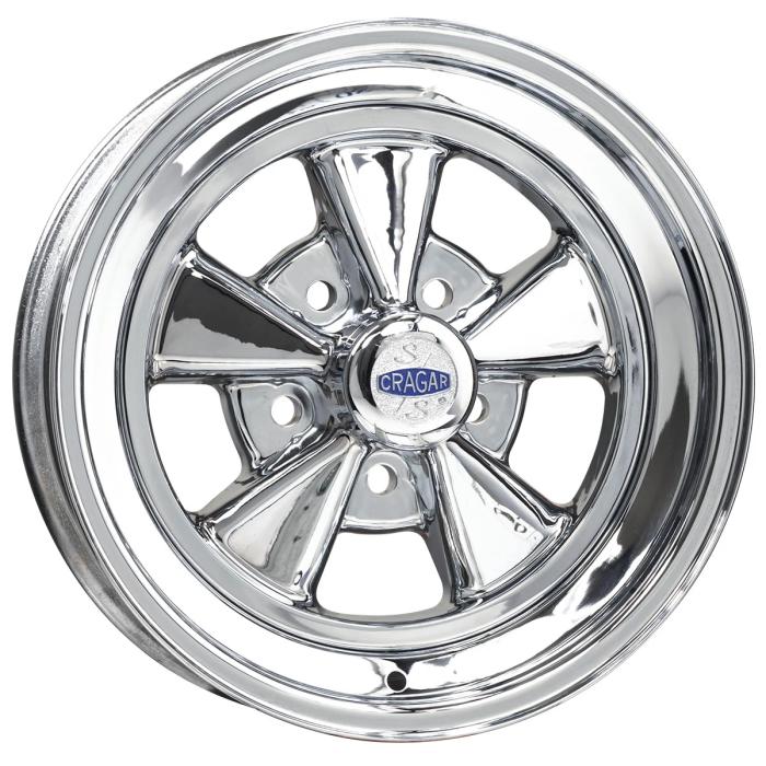 This 15x4.5 Cragar SS wheel features a 5x4.75-inch small GM bolt pattern, offering fitment for hot rods and muscle cars, like a Chevrolet Camaro, Chevelle, Corvette or classic Pontiac, Oldsmobile or Buick muscle cars. Cragar SS front runner wheels feature 2 inches of backpacing, giving you the classic drag racing look with fitments for a wide variety of cars. This includes street machine, day 2 muscle car, T-Bucket, and many other applications. Cragar wheels give your hot rod, muscle car, classic truck or gasser the perfect old school look. The Cragar SS Series 61C takes the timeless design and gives it proper fitment with direct drilled bolt pattern, instead of the old uni-lug design. Cragar SS wheels are built with a steel rim and aluminum center, and feature a show-quality chrome finish. The 61C features a conical lug nut seat, and bulge seat lug nuts are suggested (sold separately). The chrome plated center cap with iconic Cragar S/S logo is included with every wheel.