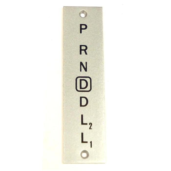 Console indicator upgrade for a factory console with display for various automatic transmissions. These indicators may be installed with two screws. The indicators are silver powder-coated with black lettering.