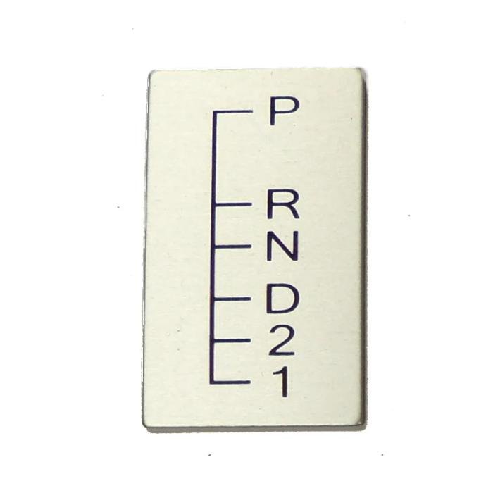 Console indicator upgrade for a factory console with display for various automatic transmissions. These may be installed with adhesive or RTV silicone. The indicator is brushed aluminum with black lettering.