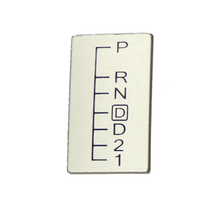 Console indicator upgrade for a factory console with display for various automatic transmissions. These may be installed with adhesive or RTV silicone. The indicator is brushed aluminum with black lettering.
