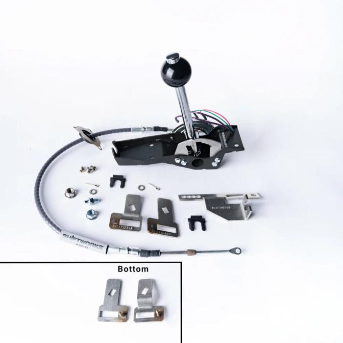 The shifter connects to the transmission with an included cable linkage. The cable mounts to the transmission with the provided pan bracket (case mounted on 6L80E, 6L90E, & 8L90E) and the correct length shift lever(s) is included as well. We even install the neutral safety / back up light switch and adjust it for you, so it's ready to simply wire into your car!