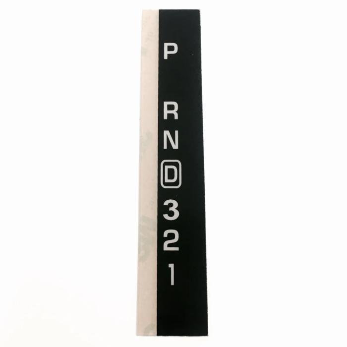 Console indicator upgrade for a factory console with display for 4-speed overdrive or 6/8-speed automatic transmissions. These indicators may be installed over the existing indicator as an overlay. They are black with translucent lettering.