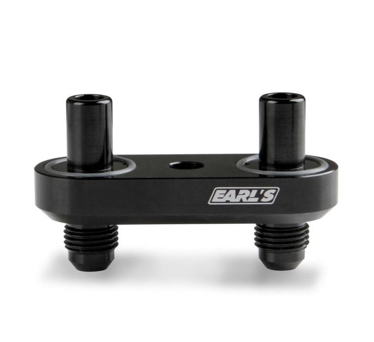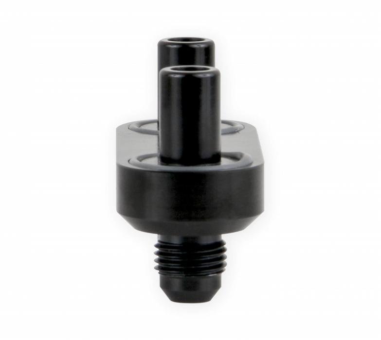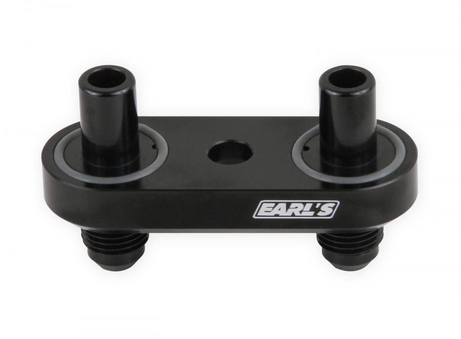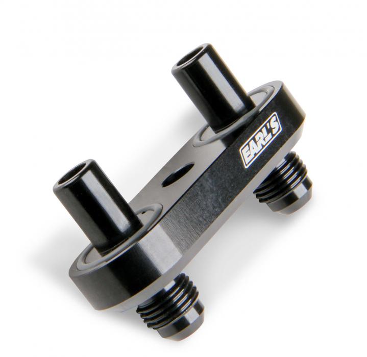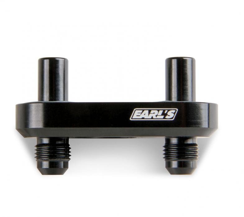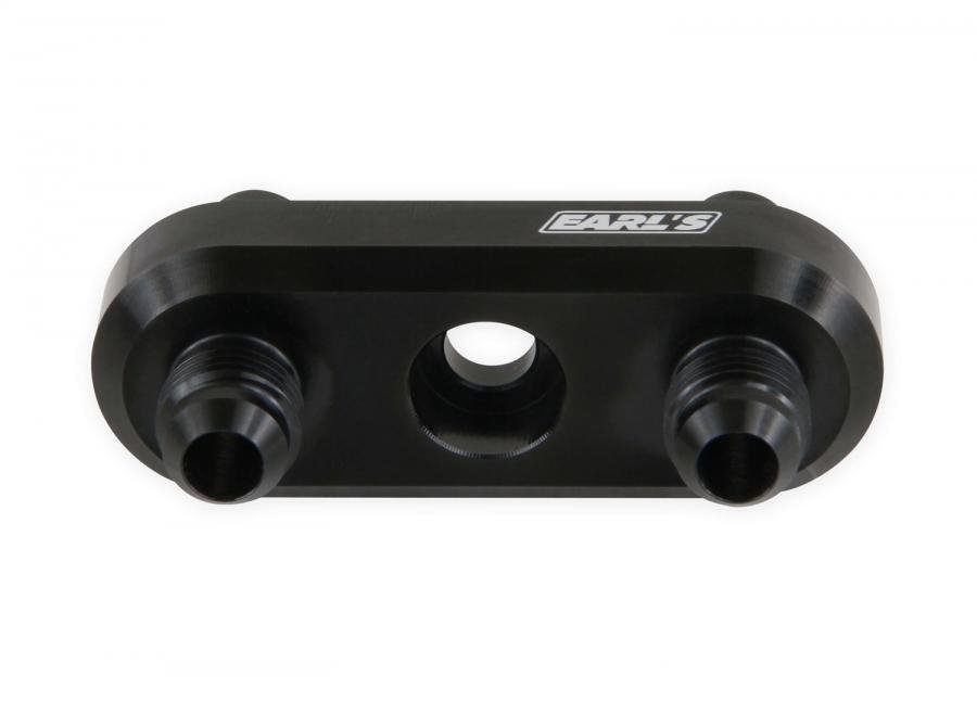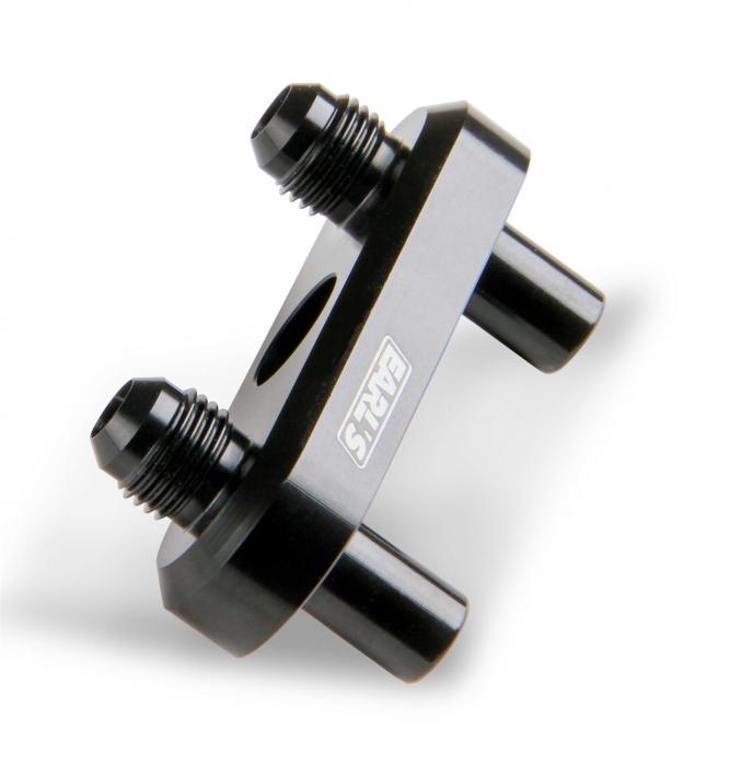 Earl's Transmission oil cooler adapter allows easy installation of AN -6 hoses & oil cooler on late model GM 6 & 8-speed automatic transmissions (fits 6L80E, 6L90E, and 8L90E transmissions). This adapter replaces the factory thermostat. These adapters use O-Ring seals and have -6 AN male flares for use with AN pluming & Earl's oil coolers. Black Anodized finish.