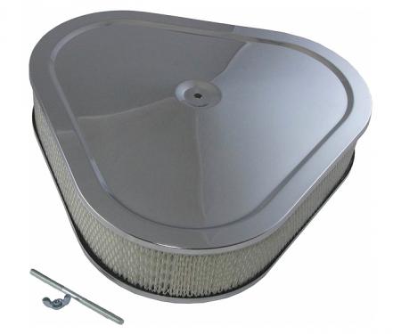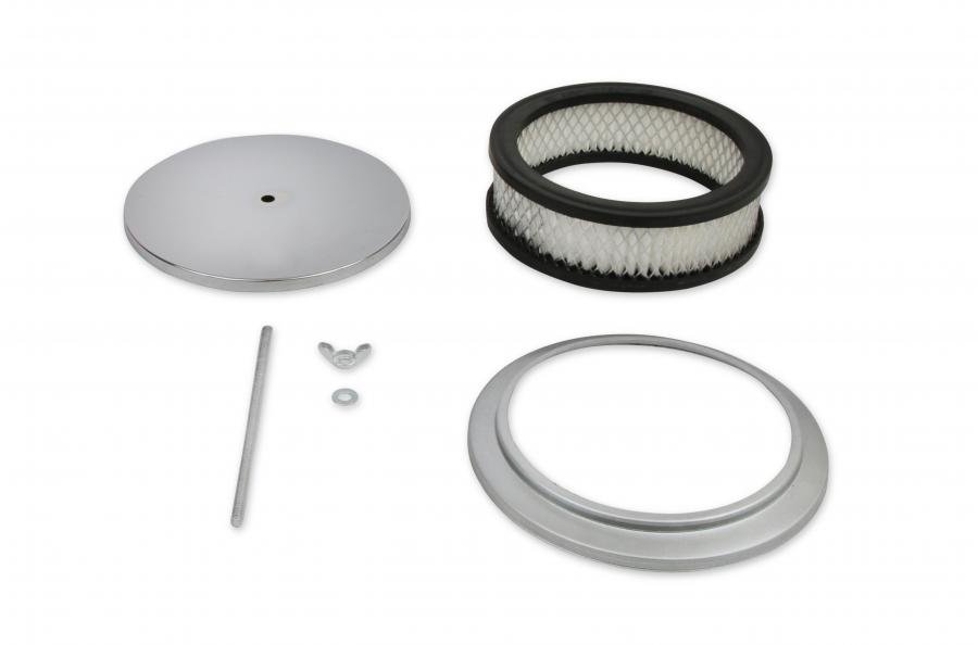 This Mr. Gasket Air Cleaner has chrome plated steel top and base. Fits most carburetors with a 5-1/8 inch neck. Has a 6-1/2 x 2 inch open paper filter element and the carb stud and retaining wing nut are also included.