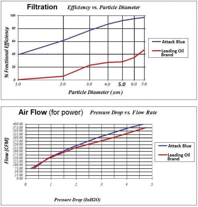 ITS A FACT that nanofibers provide the absolute best air flow while at the same time providing the best filtration overother traditional filtration media. This is undisputable.  Nanofibers are ultra-fine, so much smaller and thinner than traditional spun fibers. This allows you to pack more filtering media in the same amount of space which will still allow air to flow but it creates a treacherous path for dirt & debris so it gets caught up and captured.  Independent testing shows Attack Blues proprietary dry Nanofibers capturing dirt down to an