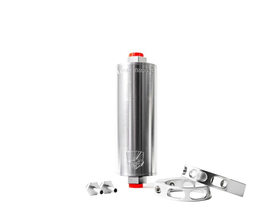 The Vapor Trapper™ can be easily mounted using two 2-1/2” clamps put in line with your fuel tank vent line. Use #6 AN O-ring Boss fitting (barb fittings with a rubber fuel hose or a threaded AN fitting for a more custom installation). Make sure to install the Vapor Trapper™, or at least the inlet line, far above the fuel tank to avoid liquid fuel getting into the filter. Fuel getting into the Charcoal media drastically reduces the performance of this product. If this occurs, please contact us so we can recharge your Vapor Trapper™.