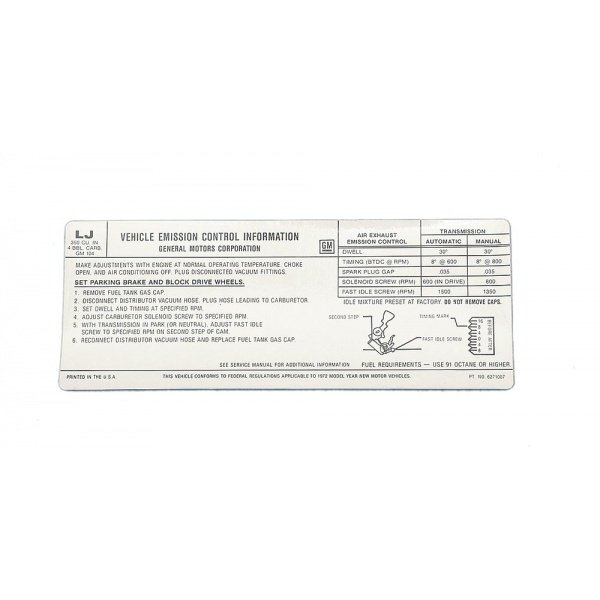 Corvette Emission Control Decal, With 200hp, 1972:
