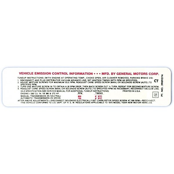 This Corvette reproduction emission control decal has been manufactured to original factory specifications using today's modern manufacturing techniques. You will find the fit, finish and function will work superbly for your restoration.