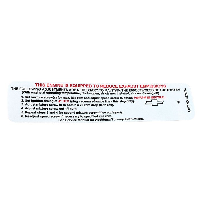 Vehicle tune-up & emissions control decal, engine code F, all w/ 390 h.p. On early 1968 cars the decal is located on the top of the radiator and on late 1968 cars the decal is located on firewall behind the master cylinder. This decal shows tune-up and emissions specifications.