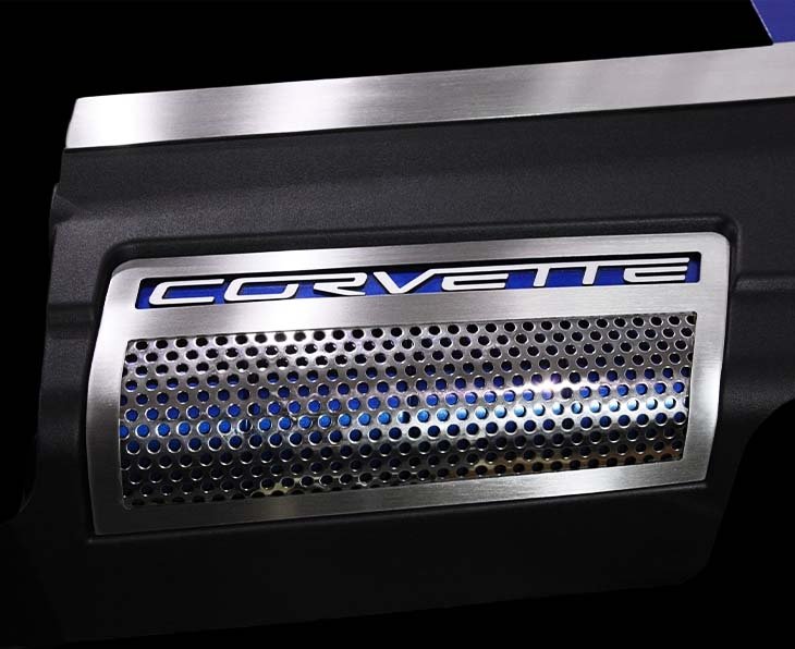 These are truly custom accessories made of the finest T304 hand polished perforated stainless steel. Our ZR1 (2) Piece Perforated Factory Side Shroud Covers feature a window that allows your Factory Corvette Logo to show through. These Corvette accessories are designed to peel and stick to the factory engine shroud in minutes. Whether you choose the Blue LED Illuminated Engine Shroud Side Inserts - 043072, or this non-illuminated version (shown), you will be sure to stand out at your next car show! Compliments our Perforated Alternator Cover 043068.