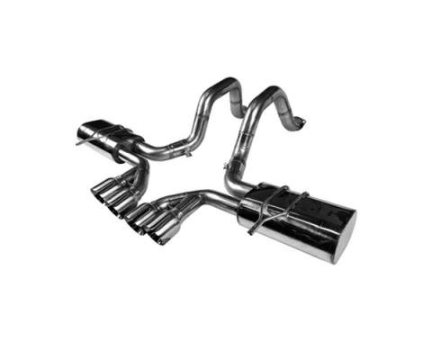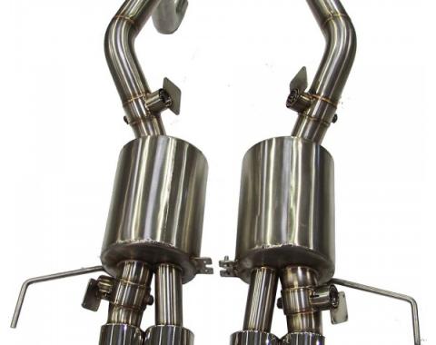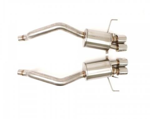 Mandrel Bent Axle Back Exhaust System, 2.5 Inch Or 3 Inch Diameters 100% T-304 Stainless Steel Construction With TIG Welds Quad 4" Polished Tips & Polished Oval Multi-Core Racing Mufflers Connects To OEM Factory Connection Points…