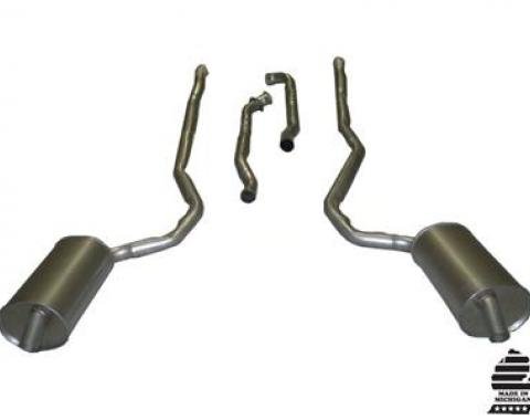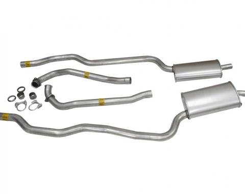 "Original factory exhaust systems came on the car with the secondary pipe welded to the muffler. Exhaust system components are made from 14 gauge (.070) aluminized pipe.