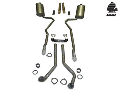 "Original factory exhaust systems came on the car with the secondary pipe welded to the muffler. Exhaust system components are made from 14 gauge (.070) aluminized pipe.