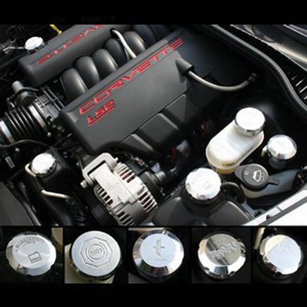 Add some style and brightness to the engine compartment of your C6 Corvette with this polished aluminum cap set. Available for automatic and 6 Speed transmissions. Please select below. C6 Automatic transimission 5-piece set includes: (1) Oil Cap (1) Power Steering Fluid Cap (1) Brake Fluid Cap (1) Washer Tank Cap (1) Coolant Cap C6 & Z06 6-speed manual transimission 6-piece set includes: (1) Oil Cap (1) Power Steering Fluid Cap (1) Brake Fluid Cap (1) Coolant Cap (1) Washer Tank Cap (1) Clutch Slave Cylinder Fluid Cap